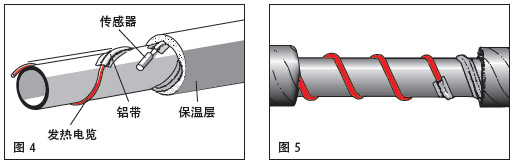 塑料管道安裝發(fā)熱電纜前,要用鋁帶粘粘在管道上以便發(fā)熱電纜的固定,并可保證更好的熱分布。發(fā)熱電纜應(yīng)附著在管道下方或?qū)ΨQ分布。傳感器的安裝與其他應(yīng)用一樣,紅