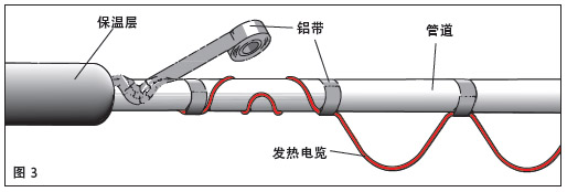 管道上,大約每隔25-30cm,發(fā)熱電纜需用鋁帶斜貼固定,固定后,所有發(fā)熱電纜需用鋁帶覆蓋住。這樣可以防止發(fā)熱電纜與保溫層直接接觸,并保證外壁與電纜的緊密結(jié)合。