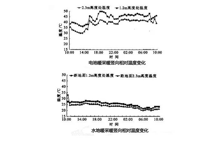 從圖我們可以看出,發(fā)熱電纜供暖時(shí),相對(duì)濕度平均為41.5%,水地暖采暖時(shí),相對(duì)濕度僅為24.5%。