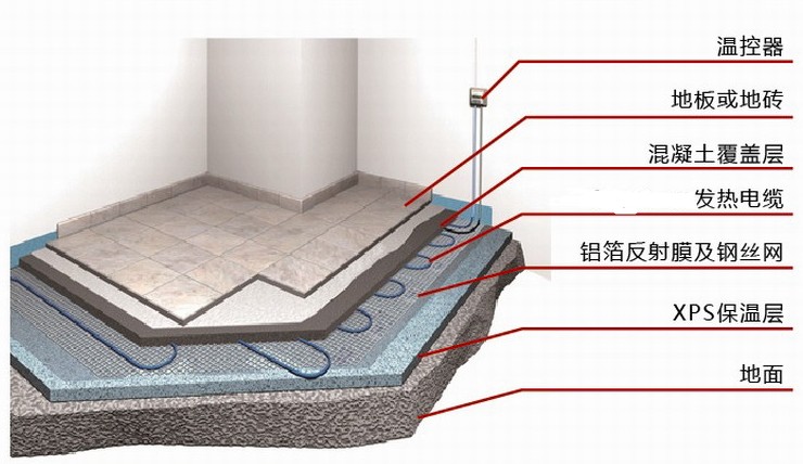 發(fā)熱電纜地面輻射供暖系統(tǒng)以發(fā)熱電纜為發(fā)熱體,通電發(fā)熱,以低溫輻射的方式溫暖整個(gè)房間。在實(shí)際安裝的時(shí)候,有兩種方式,濕式安裝和干式安裝。我們以安裝比較多的方式—濕式安裝方式為例。