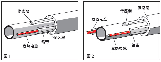 塑料管道安裝發(fā)熱電纜前,要用鋁帶粘粘在管道上以便發(fā)熱電纜的固定,并可保證更好的熱分布。發(fā)熱電纜應(yīng)附著在管道下方或?qū)ΨQ分布。傳感器的安裝與其他應(yīng)用一樣,紅