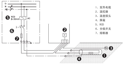 3、必須根據(jù)當(dāng)?shù)氐碾娏Ψㄒ?guī)對每個發(fā)熱電纜屏蔽進(jìn)行接地,并連接至漏電斷路器 (RCD);