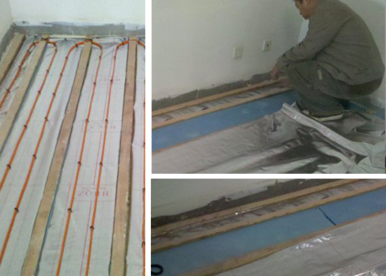 5、覆蓋水泥層,水泥層起到蓄熱的作用,不是越厚越好,厚度要適中,一般水泥層復(fù)雜2-3.5cm左右。鋪設(shè)時(shí)以平行的兩條木龍骨為高度參照,水泥厚度僅需與木龍骨齊平即可,這樣保障鋪設(shè)的高度不至于太高,與門(mén)高產(chǎn)生沖突。